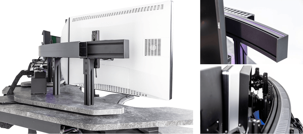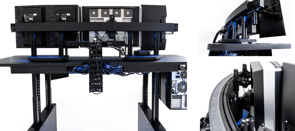 Our monitor arc and mounts support a vast range of monitor sizes, weights, and configurations, offering endless possibilities for your workspace. Scroll right and click for a full screen view of our Rollervision system and best-in-class cable management.