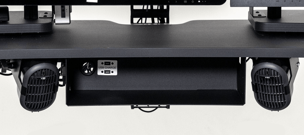 Our included data dock comes standard and provides 4 USB-A ports along with a storage shelf to with another USB-A, USB-C, and 2 outlets