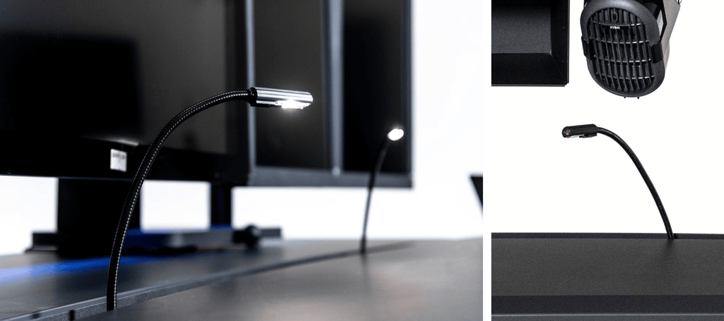 - Xybix desks are equipped with a variety of custom lighting options including adjustable desktop lights, footwell lighting, bias lighting, monitor arc lighting, panel lighting, and more.
