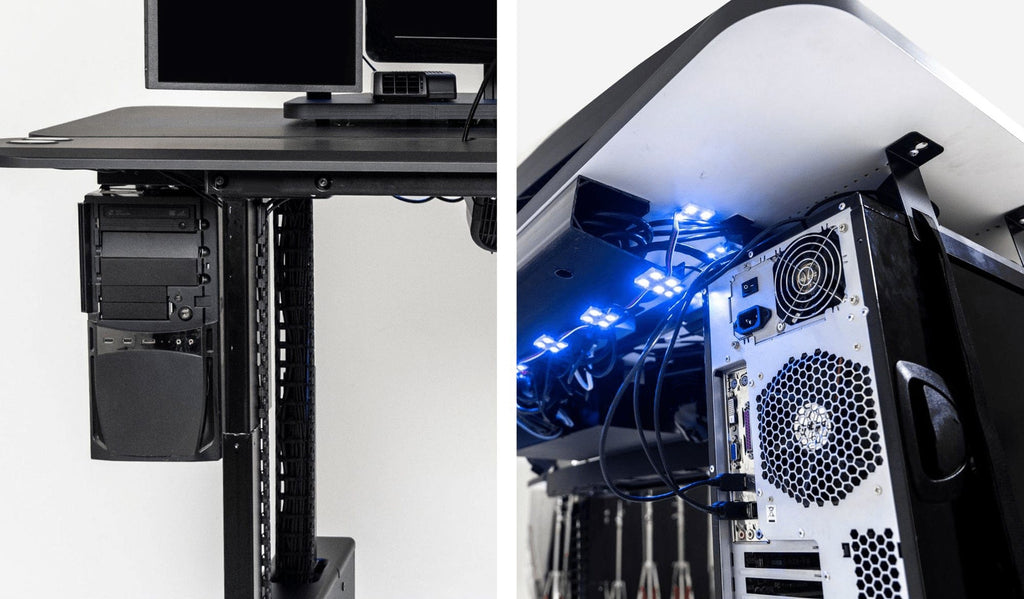 Our under-desk monitor mounts keeps keeps your PC off the floor and your cables managed for a clean look. Additionally, the design allows easy access for upgrades.